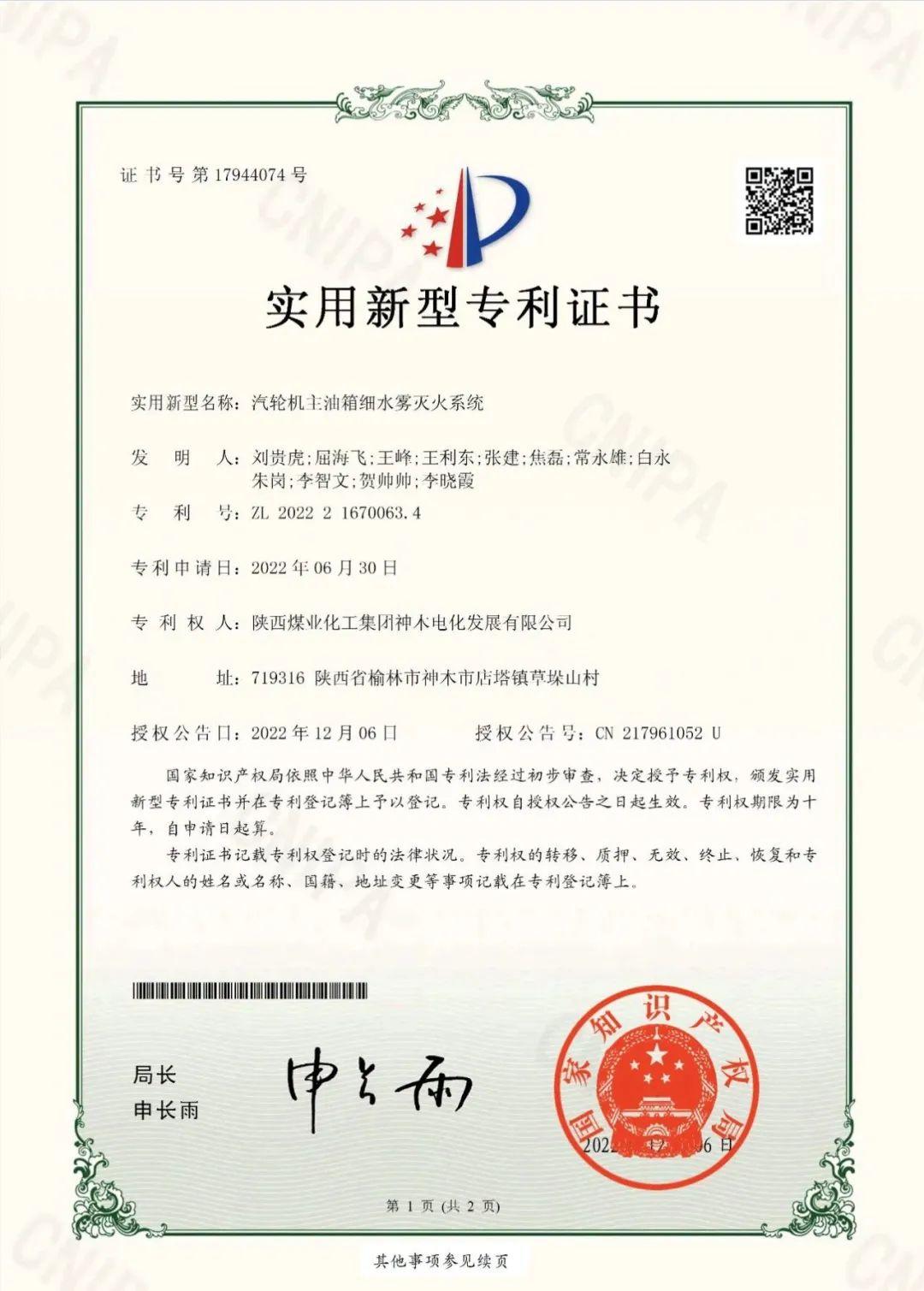 近日,電化公司自主研發(fā)的“汽輪機(jī)主油箱細(xì)水霧滅火系統(tǒng)”經(jīng)過國家知識(shí)產(chǎn)權(quán)局審查,獲得國家實(shí)用新型專利授權(quán)。