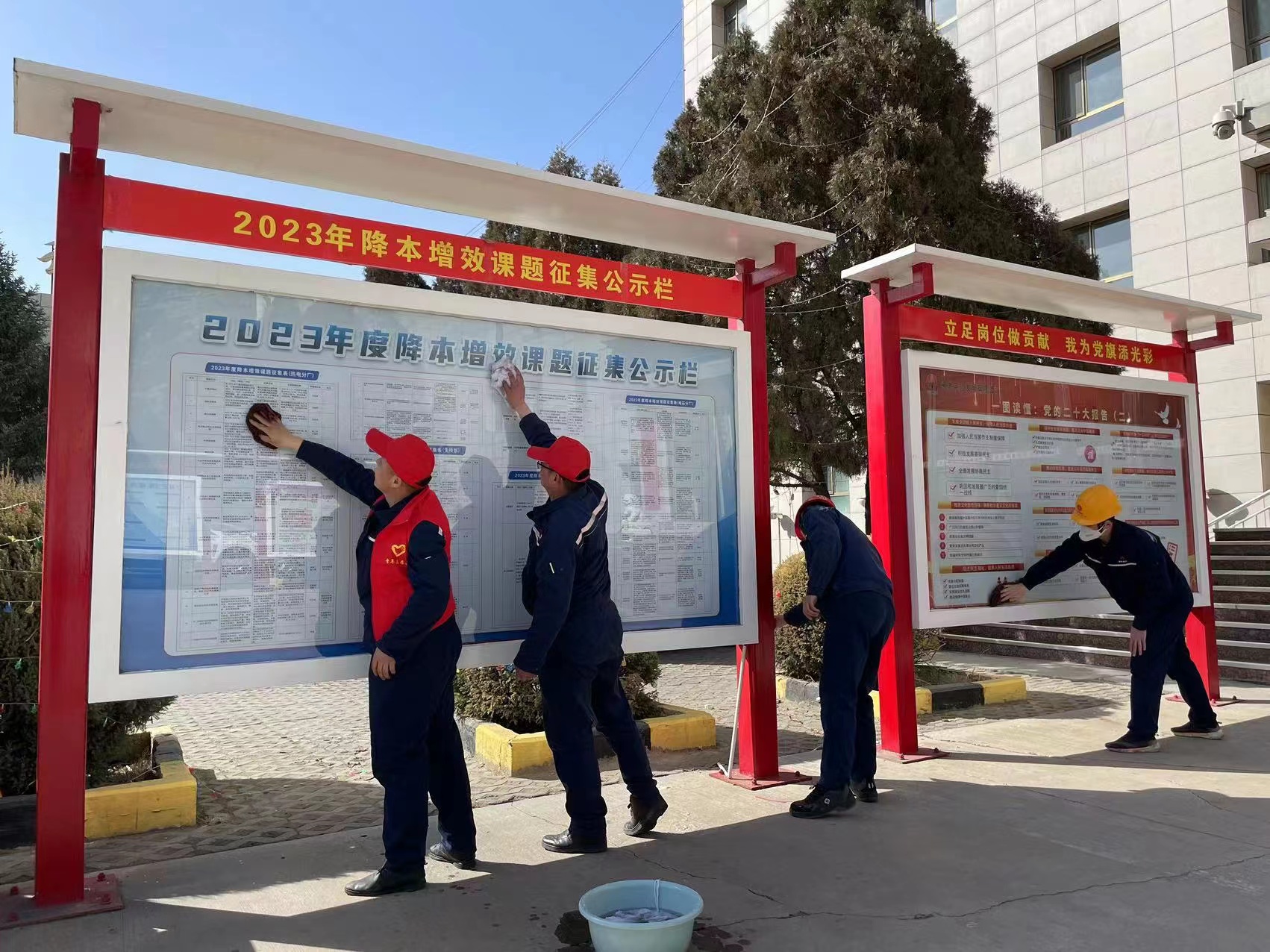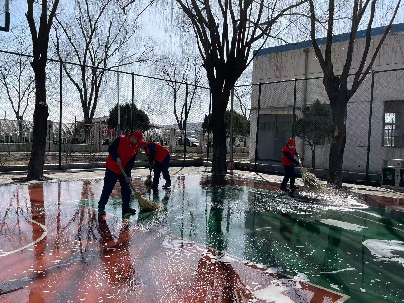 他們有的正在精心為職工免費(fèi)理發(fā)、有的清理廠區(qū)花園的各類垃圾、有的正在和籃球場地面的積灰“較勁”、有的正在為宣傳欄“清理擦身”、有的正在為蓮品苑“沐浴洗禮”…