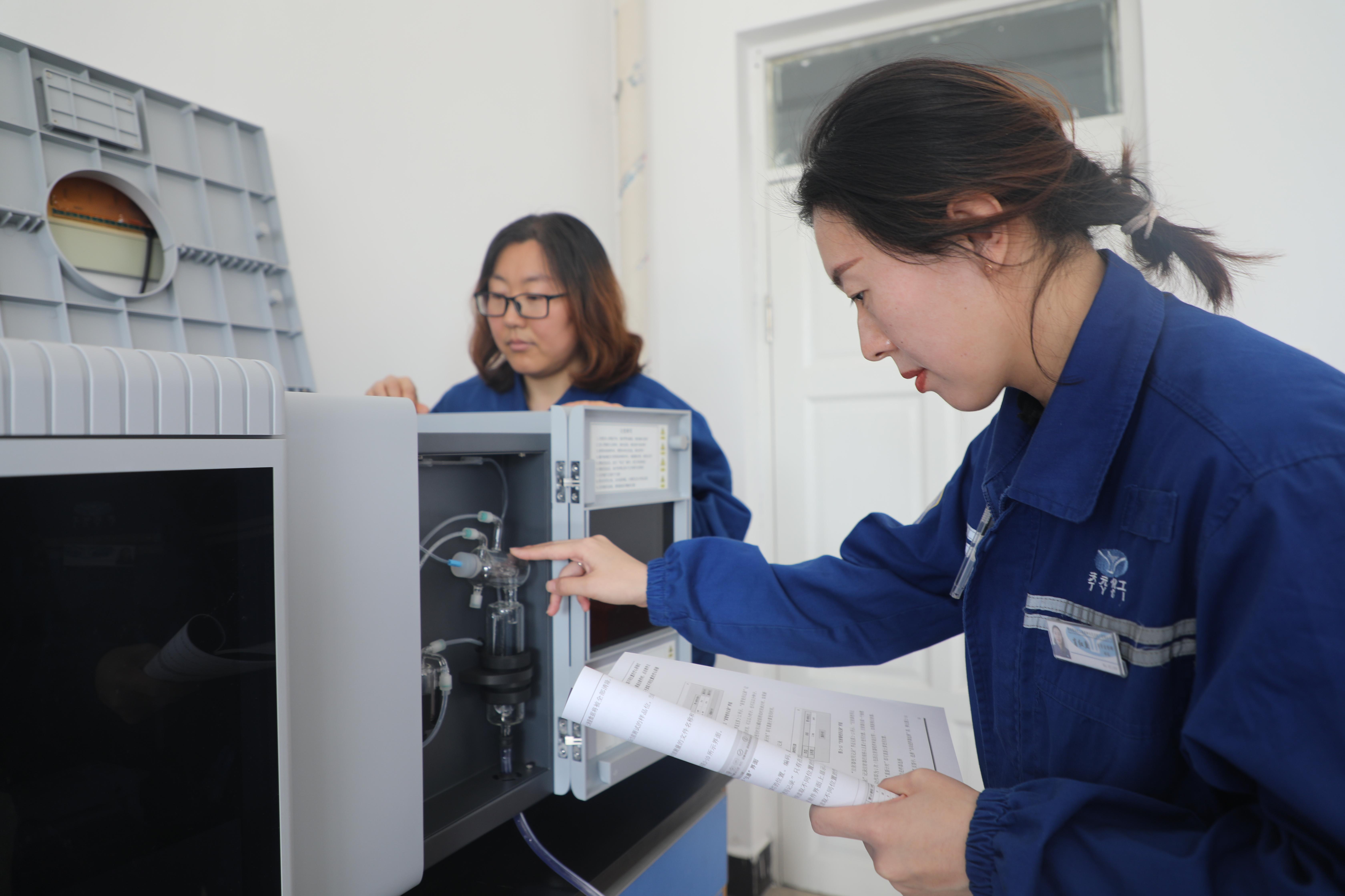 質(zhì)量監(jiān)督部姬飛燕和肖紅魚在學(xué)習(xí)水質(zhì)分析儀器使用方法