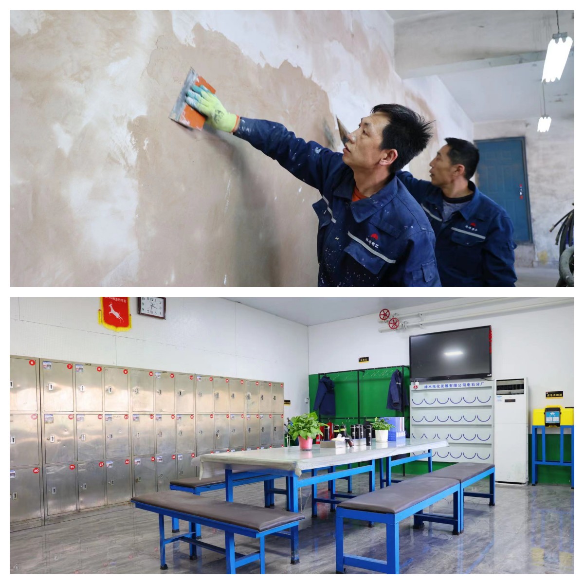休息室對(duì)生產(chǎn)一線職工而言是高強(qiáng)度工作之后的放松地,是疲憊后舒緩壓力的港灣。近日,神木煤化工電化公司掀起了美化車間的熱潮,張小平變身“粉刷匠”利用休息時(shí)間為車間一樓至四樓的所有防護(hù)欄、樓梯、生產(chǎn)設(shè)備刷漆,重新布置了出爐工休息室。光滑大氣的地板來自舊區(qū)廢棄地板磚重新拋光打磨后重見天日,精致美觀的皮質(zhì)椅子是手工包制完成的,安全帽放置架和衣架DIY是用鋼材焊接的。在一間不大的休息室內(nèi),因地制宜配備了冰箱、微波爐、餐桌椅、儲(chǔ)物柜等生活必需品,為職工提供舒適衛(wèi)生的休息環(huán)境。