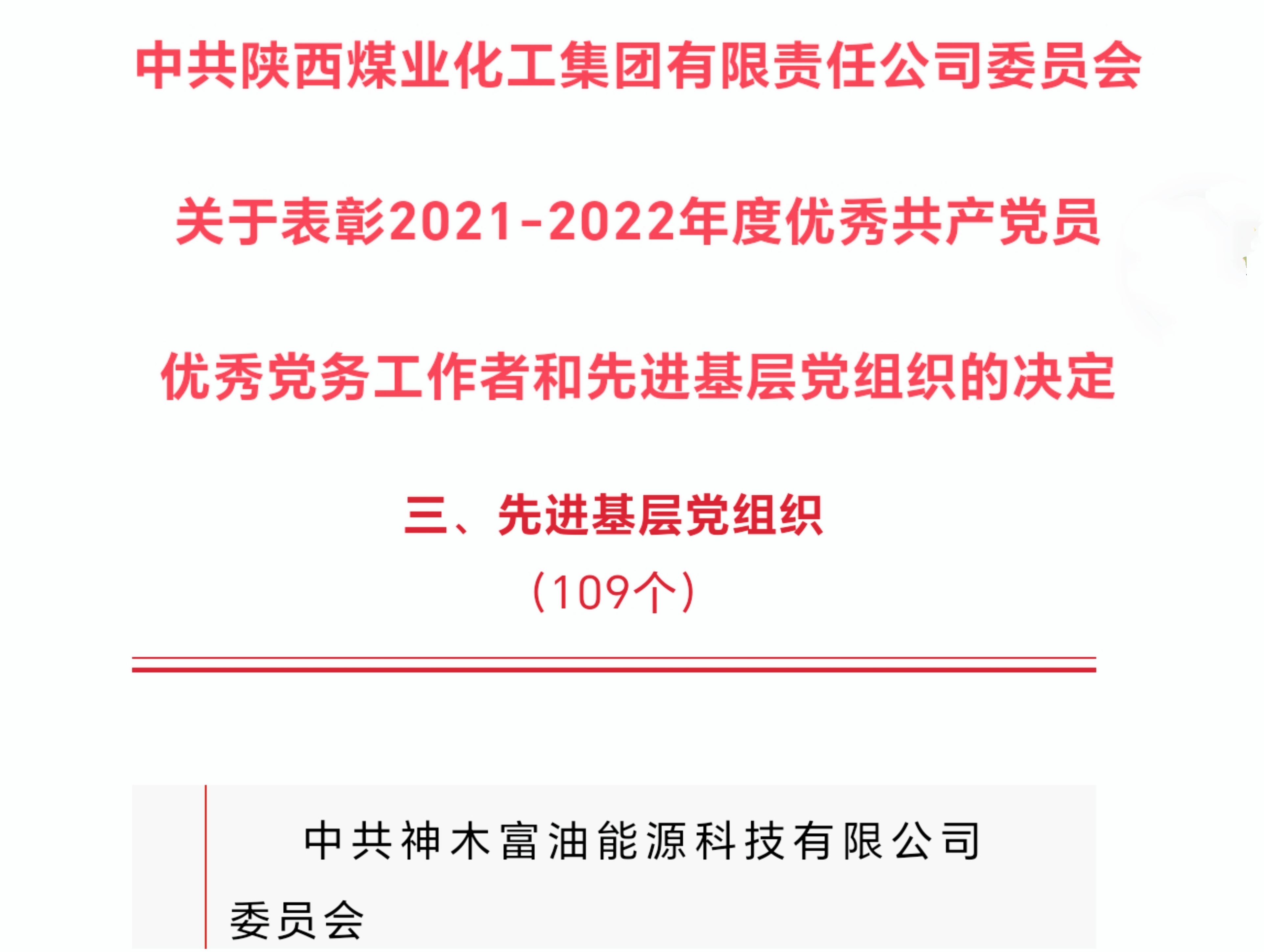 在慶祝中國(guó)共產(chǎn)黨成立102周年之際,陜煤集團(tuán)表彰了一批“兩優(yōu)一先”先進(jìn)基層黨組織、優(yōu)秀共產(chǎn)黨員和優(yōu)秀黨務(wù)工作者,神木煤化工富油公司黨委榮獲“先進(jìn)基層黨組織”稱號(hào)。