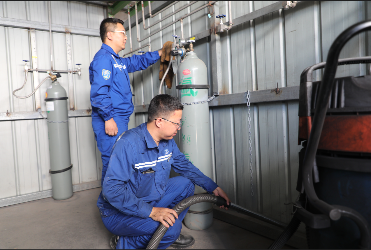 質(zhì)量監(jiān)督部運行二班劉超和馮杰在清理氬氣瓶間衛(wèi)生