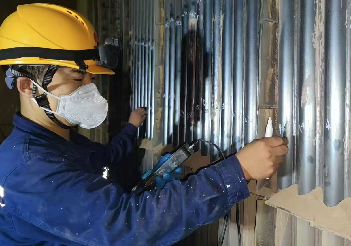 針對水冷壁磨損帶來的安全隱患,電化公司立即啟動了全面的防磨防爆治理工作。面對爐膛水冷壁高達42.967米的復雜結構,工作人員以“繡花”般的精細態度,對每一根水冷壁管進行了無死角、高精度的壁厚測量。通過數據比對分析,準確識別出壁厚低于安全標準的管段,為后續的治理措施提供了堅實的數據支撐。同時,根據測量結果制定了科學的治理方案,對壁厚不足的管段進行了更換或補焊加固處理,有效消除了安全隱患。