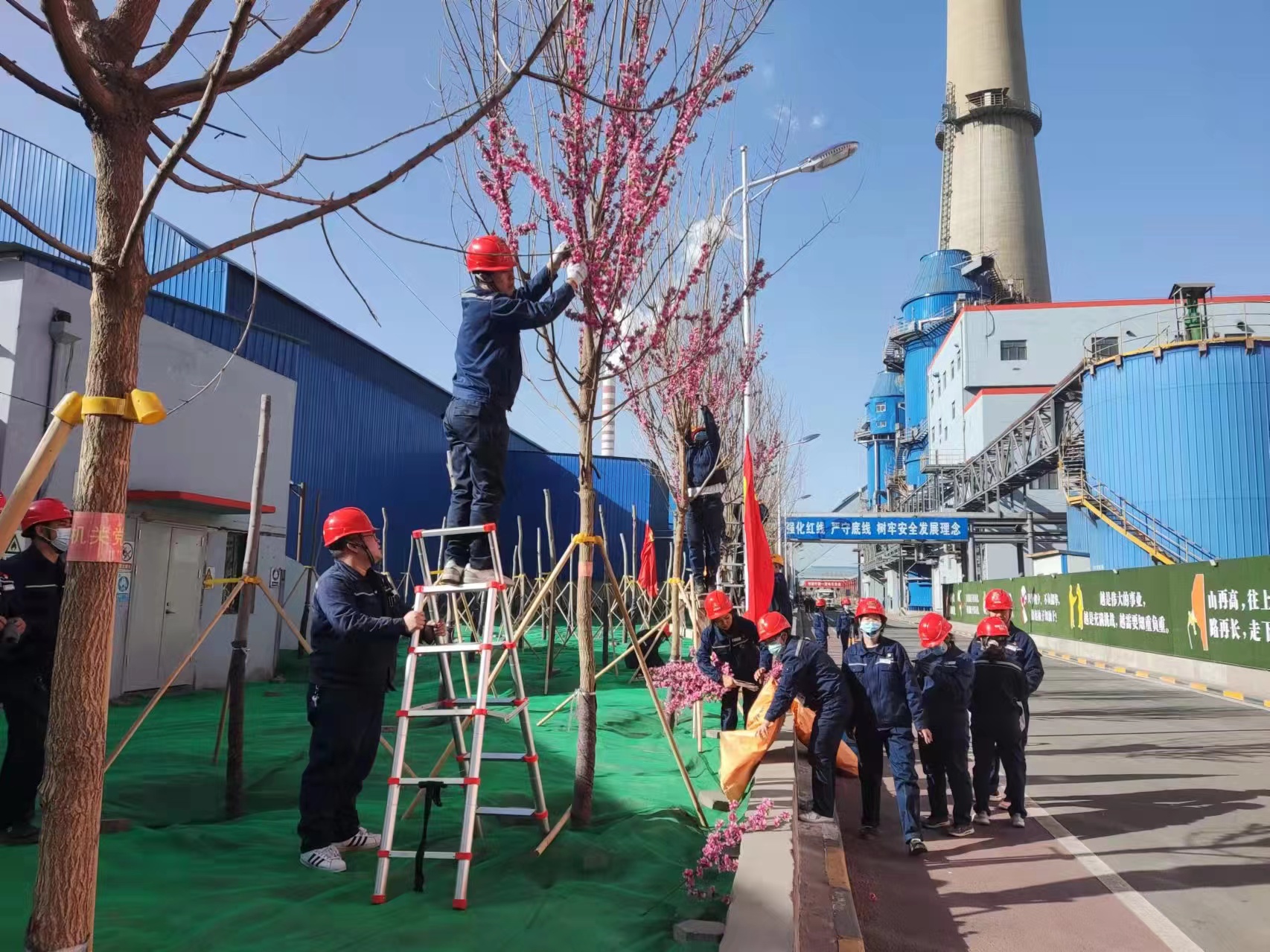 活動分為7個小組分解開展,由各部室青年志愿者組成楓樹維護組;5個黨支部、2個團支部組成5支桃樹維護組;熱電分廠、電石分廠青年志愿者組成廠區道路清掃組。活動中大家充分發揚了不怕臟、不怕累、不怕苦的精神,經過一下午的辛勤勞動,廠區環境得到了明顯改善,春節裝扮花朵的拆卸,為小樹成長發芽做足了準備,并為下一步綠色工廠建設工作提供基礎保障。